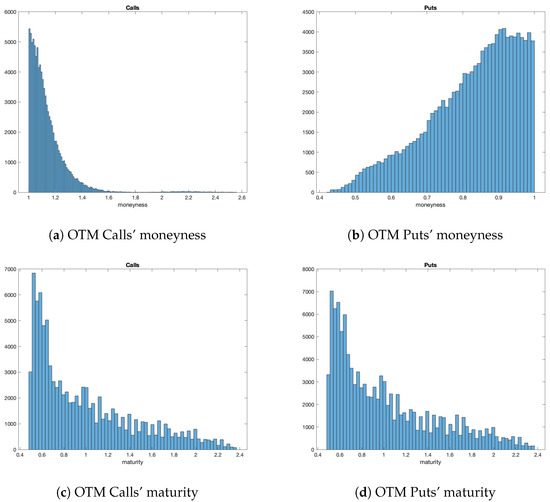 The price of the option is defined as the average of the bid and ask price when both are available; the observation is removed otherwise. Finally, options with zero trading volume and negative bid-ask spread are also excluded. The final sample counts 92,879 valid call and 112,347 put options observations over 259 weeks. Figure 2 shows the options’ distribution in terms of moneyness and maturity.