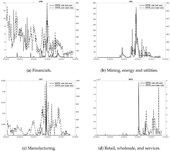 Comparison of daily average calculated over call and put options for four companies representing the four selected industries/sectors. As expected, calculated using call (solid lines) options is much smaller than those obtained from put (dashed lines) options. s are expressed in basis points. Sub-figures (a–d) display the measure for companies operating in different sectors.