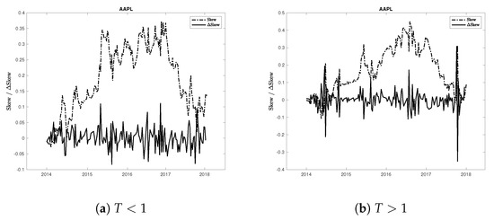Time-series of skew extracted from short-term maturity options (, panel (a)) and from long-term maturity options (, panel (b)) for AAPL. Both panels show that the time series of the levels of Skew (dotted-dashed line) is non-stationary whilst the increments (solid line) are stationary.