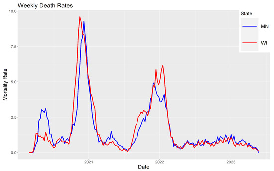 The choice of these two upper Midwestern states is also explained by the easy availability of COVID-19 data in a similar synchronized weekly format. In both Minnesota and Wisconsin, the first COVID-19-related deaths were recorded 19 March 2020. It would be interesting to consider mortality for different age groups, but full age data were not easily available in open-source format. Further analysis is intended to be expanded to other adjacent states and different countries in the world, but in that case, the difference in public data formats may be substantial.