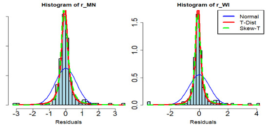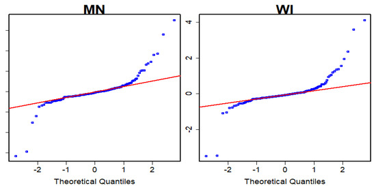 Along the lines of Section 3, we began with the normality test for the residuals of MN and WI series denoted by and . Violation of normality would substantially affect the further results. We can graphically observe fat tails (and possibly, skewness) in the plots. With no residual autocorrelation in and , they can be treated as independent samples.