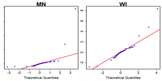 Normal q-q Plots of ARIMA residuals for Minnesota (MN) and Wisconsin (WI).
