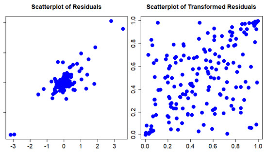 Before performing the joint distribution analysis, we can visualize the relationship between the two sets of residuals to get an idea of their dependency structure. The graphs in Figure 5 represent standardized residuals of the ARIMA model in the left panel and transformed values using parametric estimates from Table 2 in the right panel. The left panel shows some outliers caused by both the bivariate dependence and the behavior of the marginal distributions, while the right panel illustrates lower and upper tail dependence free of the marginal effect. Both suggest the use of a copula model. Clustering of points both in the lower left and in the upper right corners may serve as a clear indicator of tail dependence.