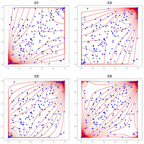 Since both lower and upper tails seem to be present in Figure 5, we performed copula analysis for all five families described in Section 4, using the tailless Gaussian C4 as a benchmark. The best candidates in each family were selected via MLE. Some technical difficulties were encountered in the case of Student t-copula, and numerical optimization was performed using Nelder–Mead and Broyden–Fletcher–Goldfarb–Shanno methods. The data for five families are summarized in Table 4, providing information criteria values, model induced Kendall’s , calculated according to Section 4, Cramer–von Mises test p-values and tail dependence coefficients (lower in case of C1, upper in case of C2 and C3, symmetric lower and upper for C4 and C5). We can observe that the empirical Kendall’s concordance value is . The best fit is indicated by the bold font.