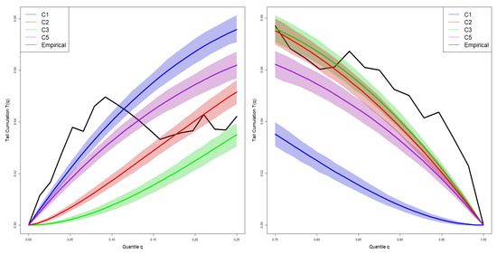 In order to provide some intuition for the tail dependence figures, Figure 7 contains graphs of empirical tail cumulation compared with the tail behavior expected of selected models. We generated 10,000 samples from each candidate copula model using a bootstrap sampling method and chose quartile intervals for the lower and upper tails ().