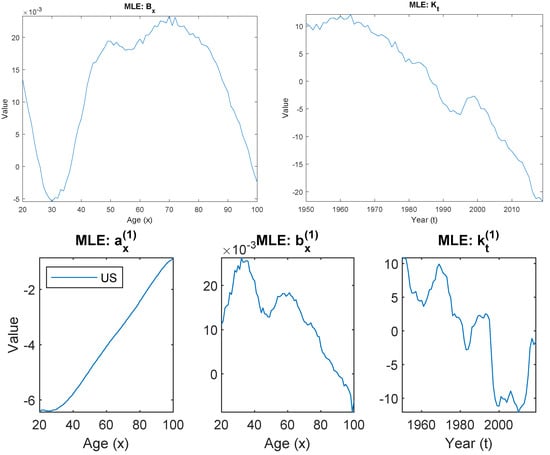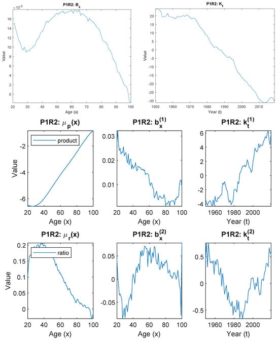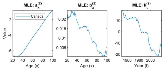 The parameter estimation of the PR model is achieved through the demography package () in R. We specify and such that the PR model is comparable to the ACF model defined in the previous section. The notation of and in the product model can be simplified to and , respectively.