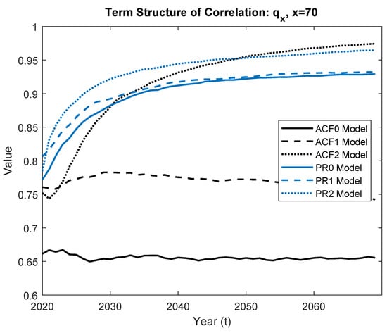 Finally, we present the term structure of correlation between and , the death probabilities calculated for the two populations. Following (), the term structure of correlation is defined to be , for . For illustration, we select , and provide the term structure of correlation between and over the period of 2020 to 2069 (that is, a 50-year forecast window) in Figure 3. We assume constant force of mortality, so and is linked through the following equation: