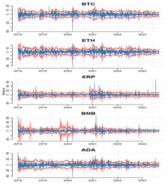 These events manifest in our graphical representations, effectively showcasing the responsiveness of our optimally fitted models to unexpected market developments. As can be seen in Figure 4, cryptocurrency returns are plotted in blue, alongside a red line indicating two standard deviations as a measure of risk. What stands out in this visualization is the remarkable adaptability of the two-standard-deviation bounds to the well-documented phenomenon of volatility clustering in financial time series.