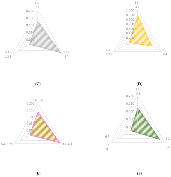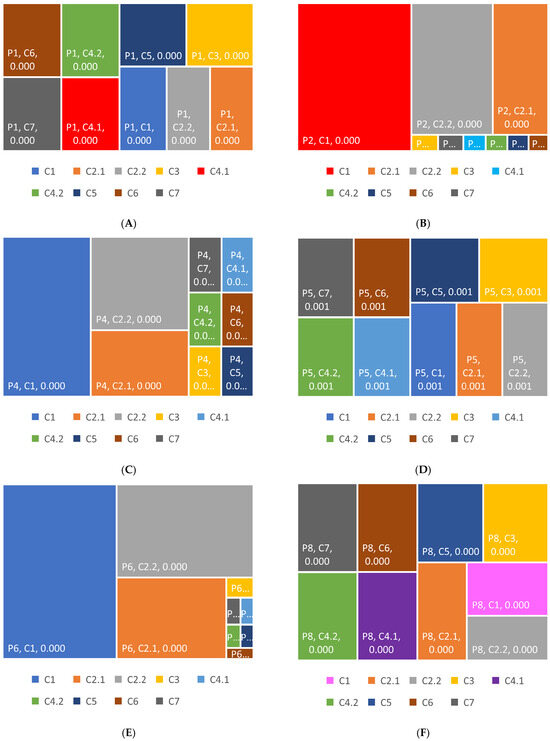 Treemap showing the strength of the relationship between the current rate of return for a holder of bonds issued in the Czech Republic and bonds issued in Poland in the weekly trend. (A) Treemap showing the strength of the relationship between the current rate of return for a holder of bonds issued in the Czech Republic with the P1 bond. (B) Treemap showing the strength of the relationship between the current rate of income for a holder of bonds issued in the Czech Republic with the P2 bond. (C) Treemap showing the strength of the relationship between the current rate of return for a holder of bonds issued in the Czech Republic with the P4 bond. (D) Treemap showing the strength of the relationship between the current rate of return for a holder of bonds issued in the Czech Republic with the P5 bond. (E) Treemap showing the strength of the relationship between the current rate of return for a holder of bonds issued in the Czech Republic with the P6 bond. (F) Treemap showing the strength of the relationship between the current rate of return for a holder of bonds issued in the Czech Republic with the P8 bond. Source: Own elaboration based on calculations in the Matlab program.