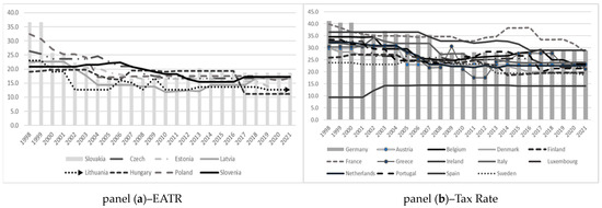 Empirical data related to European OECD economies show that the EATR has displayed decreasing tendencies from 1998 to 2021 (Figure 1). Furthermore, most of the observed economies, especially the emerging, followed the EATR in Ireland. One of the most important reasons for Ireland’s success has been recorded as being its low EATR; namely, the tax rate is notably below average, between 9.4% and 14.1% (Figure 1, panel (b)). In the group of emerging economies, Slovakia notably decreased the EATR between 1998 and 2004, from 36.7% to 16.5%, slightly increasing it after 2013. Poland lowered the EATR even before EU membership, from 32.4% to 17.1%; however, after the membership year, the EATR was slightly raised to 17.5% and again lowered to 16% in 2019 (Figure 1, panel (a)). In the group of developed economies, Germany and France had the highest rate of EATR; however, France constantly decreased their EATR in the observed period, from 39.2% to 28.1%. Another developed economy, Portugal, also applied a competitive tax strategy of lowering the EATR between 1998 (33.4%) and the global financial crisis (23.7%); subsequently, the EATR was increased (max to 28.4%) and again reduced to 21.4% (Figure 1, panel (b)).