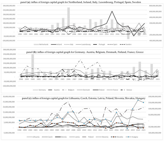 FDI in dollars in European OECD economies in the period 1998–2021. Source: Authors’ presentation based on World bank data.