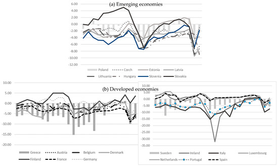 Many EU economies suffered from a high deficit and entered into an excessive deficit procedure (Figure 3). The global crisis caused higher indebtedness in the period 2008–2010, which accompanied the decrease in GDP in the years of the global, which crisis determined a sharp increase in public expenditure, creating a deeper budget deficit. In the period 2011–2019, the fiscal balance positions of the European OECD economies were improved, until the pandemic crisis.