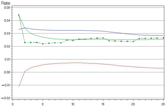 As we have already pointed out, the choice of a deterministic function is for simplicity sake, but involves, in principle, an underestimate of the inflation uncertainty. To circumvent this issue a more complex model should be used where the expected inflation is also stochastic. This is equivalent in this framework to also include a SDE for . An appropriate version of the trivariate model proposed by () could be used. A similar model was applied to the Italian bond market (). Recently, a three-factor Gaussian model suitable for claims reserving applications has been proposed in ().