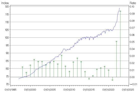 As is well-known, non-life insurance claims are exposed to both general (or economic) inflation, andto superimposed inflation. The first component is related to the trend of the overall level of prices, and is measured by the percentage changes of some consumer price index (CPI). The superimposed inflation is an additional component determined by the changes in costs of goods and services that have a specific impact on the line of business considered. A popular method to derive the historical total claims inflation (general plus superimposed) by claims data is the separation method developed by (). Further methods were proposed thereafter to detect claims inflation and, more generally, calendar year effects in claims data. A relevant advance came from the age–period–cohort models defined in () and their subsequent developments. In the present paper, however, we only consider general inflation which, of course, is estimated directly on economic data. We think that referring to economic inflation is a useful exercise to tackle the more complex (and somewhat elusive) problem of total claims inflation, since the two are necessarily correlated. For an empirical study of superimposed inflation in some lines of business, see ().