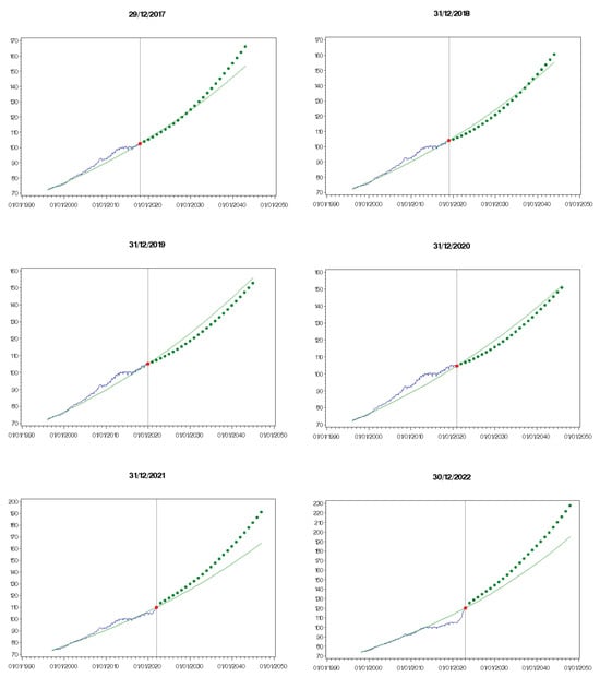 For the moment, we leave open the question of how to specify the function . Typically, a parametric form is assumed and, in stable market conditions, the parameters are estimated on a time-series of observed prices. In the current market situation, it is not appropriate to make the estimate of completely dependent on historical experience, and it is necessary to use some exogenous information. For example, at time I the for , could be provided by regulatory institutions such as EIOPA or ECB as survey-based forecasting or “planned” inflation rates. Or, the repricing factors could be directly derived from the market by observing current prices of inflation-linked securities. Expression (8) provides, for :