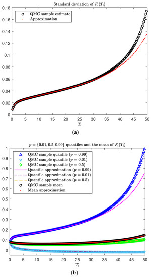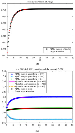 Diagnostic tool for analysing the distribution of long-dated forward LIBORs in the discretized Vasiček model. (a) Comparing the realised forward LIBOR standard deviation approximation to a benchmark QMC sample estimate. (b) Comparing the realised forward LIBOR quantile and mean approximations to their benchmark QMC sample estimates.