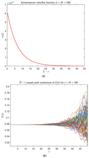 Illustrating the evolution of with a time-homogeneous exponentially decaying instantaneous volatility function under the discretized Vasiček model. (a) Visual representation of (29). (b) Sample path realisations of , for .