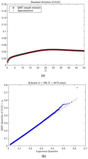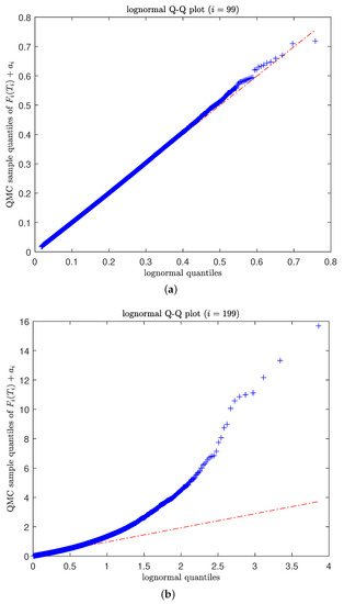 Figure 3 indicates that the approximations made by our diagnostic tool start to become less accurate for maturities longer than 35 years. This is seen in Figure 3a by comparing the realised forward rate standard deviation approximation, , (red dots) to the benchmark QMC sample estimates (black circles). A similar observation can be made in Figure 3b for the quantile approximation, , (magenta line). This is due to the gradual breakdown of the lognormal forward-LIBOR rate approximation, which can be seen in Figure 4, with the lognormal Q–Q plots for two different maturities. In particular, Figure 4a is a lognormal Q–Q plot of the realised sample QMC forward-LIBOR rate maturing at 25 years (); here, the assumption of approximately lognormal forward-LIBOR rates is reasonable. However, the lognormal Q–Q plot in Figure 4b for the realised sample QMC forward rate maturing at 50 years () shows that the lognormal assumption erodes as a result of large outlier forward LIBOR realisations.