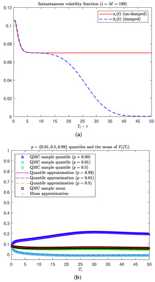 Diagnostic tool for analysing the distribution of the long-dated forward LIBORs in the five-factor DLFM scenario using the damped instantaneous volatility function in (36). (a) Comparison of the un-damped (23) and damped (36) instantaneous volatility functions. (b) Comparing the realised forward LIBOR quantiles and mean approximations to their benchmark QMC sample estimates (on the same scale as Figure 3b).