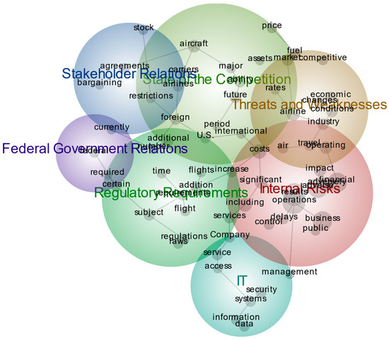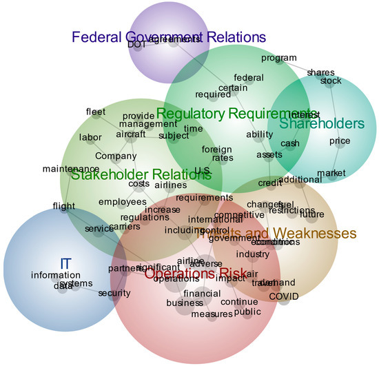 For each year, seven themes were identified by the current research. Of those, five were common themes (“State of the Competition”, “Threats and Weaknesses”, “Regulatory Requirements”, “IT”, and “Federal Government Relations”), which, although not exactly alike, share common ideas that are strong enough to be encompassed in a shared theme. Comparatively, “Stakeholder Relations” was the theme that gained more relative importance, as, on the other hand, “IT” decreased its relative importance. As explained before, this is complicit with a larger concern directed at easing investors (also with the advent of the new theme “Shareholders” in 2020) and other stakeholders while deriving attention from recurrent risks. Interestingly, the theme “State of the Competition” disappeared in 2020, from which we can presume a more considerable emphasis on internal threats in the risk reporting sections of airlines. For instance, Sobieralski’s (2020) prediction of a significant reduction in the workforce affecting an airline’s operations, and despite the CARES Act’s condition to retain jobs, is a major risk found in companies’ risk reporting sections.