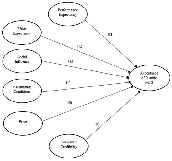 The acceptance of technology refers to the intention to accept or actual acceptance of a technology (Peek et al. 2014). New information resource utilization can be more accurately predicted if MFS providers can grasp the factors that influence user acceptance of emerging technologies. Earlier studies used behavioral intention to investigate the acceptance of any new or existing technology. Shaikh et al. (2020) utilized Islamic FinTech technology acceptance as the dependent variable in research conducted on Islamic bank users. Moreover, Jin et al. (2019) utilized behavioral intention to identify customers’ acceptance of FinTech products and services in Malaysia. In addition, studies related to Islamic FinTech adoption employed behavioral intention to measure the technology acceptance behavior of the consumers (Rahim et al. 2022; Usman et al. 2021; Widiatmo 2021).