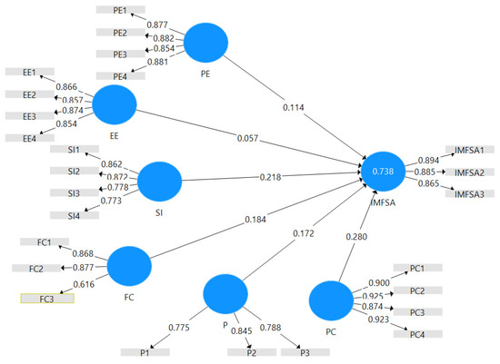 This study utilized the bootstrapping process to assess the path coefficient’s significance. Table 6 represents the path coefficient values to test the hypotheses and results of the study. A hypothesis was accepted if the p-value was less than 0.05. Based on the Table 6 results, the hypotheses H3, H4, H5, and H6 were accepted because the p-value was less than 0.05. However, the hypotheses H1 and H2 were rejected as the p-value was more than 0.05. This result also indicates that PC had the highest significance for IMFSA, followed by FC, SI, and P.