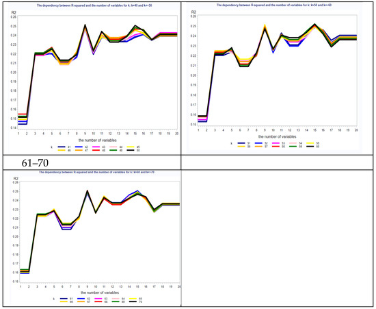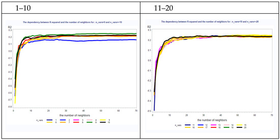 The dependency between the number of neighbours and the value of R2 was analysed, and the results are presented in Table 2. It can be seen that the increasing number of neighbours (k) influences this dependency. For a smaller number of neighbours (1–10), the R2 values do not exceed 0.2, and the lines presenting the value of k are divergent.