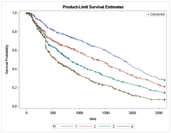 The results of the homogeneity tests across PI groups are given in Table 4. The log-rank and Wilcoxon statistics and their corresponding covariance matrices are displayed. Table 5 consists of the approximate chi-square statistics, degrees of freedom, and p-values for the log-rank, Wilcoxon, and likelihood ratio tests. All three tests indicate strong evidence of a significant difference among the survival curves for four PI groups (p < 0.001). Calculations were obtained from the Lifetest procedure in SAS.