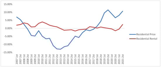 For rental indicators of residential, the dummy variable is 0 for years 2007–2010, years 2017–2018, and year 2021 and 1 for years 2011–2016 and years 2019–2020.
