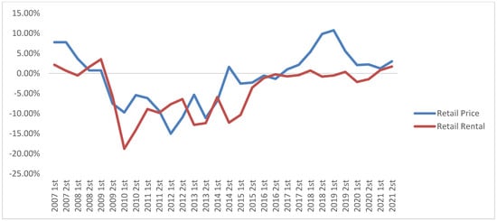 For rental indicators of retail, the dummy variable is 0 for years 2007–2008, years 2017–2018, and year 2021 and 1 for years 2009–2016 and years 2019–2020.