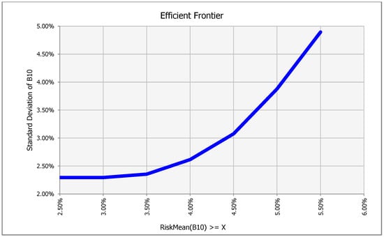 All the above-mentioned parameters were used in our model for the maximization of mean of EVA and minimization of std of EVA; we also produced the appropriate efficient frontiers curves. A similar approach is provided by  () for stock portfolios, and we contribute by implementing the approach with real estate portfolios. In every trial for calculation, the Monte Carlo Simulation ran for every input variable, and we estimated the mean and std for different levels of risk and return, respectively, and we provided the efficient frontiers curves, which are not significantly diversified in previous studies that used portfolios of stock assets, as in the work of  (). We used property assets with a similar procedure as provided by  (). Finally, we summarized the implications of our study and our conclusions, respectively. More detailed analysis is provided in the following sections of our study.