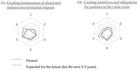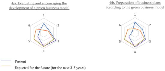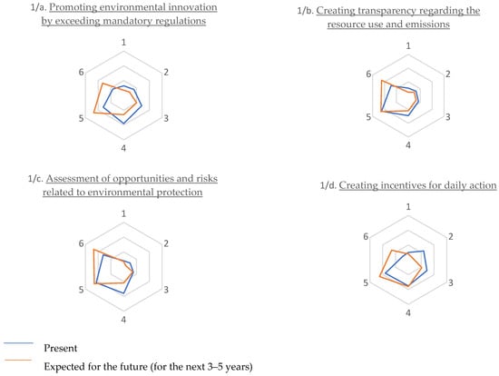 Analyses for the future (3–5-year time horizon) show that a significant increase in the number elements of the Pioneers cluster is expected, based on the definition of forward-looking environmental protection goals, at the expense of the Awakeners and Laggards clusters. In the Awakeners cluster, each step in becoming sustainable is rated slightly lower for the future than for the present, which is due to the slow catch-up of the Laggards, who also have a weak environmental goal orientation in the present.