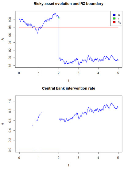 It is important to note that the support of the function is , meaning that the government will not provide aid to the bank for any reserve level s that is not within this range. The choice of is flexible, for example one can choose the function , where is a constant. It is important to note that, when using this form of the function, the salvage rate density increases with respect to h for any fixed . An example simulation of the dynamics involved in the determination of the probability of Central Bank intervention can be seen in Figure 1. In this scenario, we assumed some possible fixed values for the parameters in Equation (1) and also set that, if the reserve level drops by more than 20% from the current level, the bank is in a very critical economic condition. This means that, at the starting time, the bank is already in a stressed condition. Of course, other assumptions can be considered but, for the purpose of seeing possible multiple government interventions in the next five years, we chose this starting point. If the bank reserves drop by just 2%, the bank is in the “red region”, meaning that the government has the possibility to inject capital in order to contribute to the health of the bank. We also assumed some intensity of the negative jumps that may potentially bring the bank close to collapse despite being very liquid. This situation is similar to what can be seen during the great financial crisis, when some banks were assumed to be very liquid but, after a dramatic drop in their equity value, they were close to bankruptcy. Here, we do not consider the intervention event, which would depend on the intervention rate, in order to see the “natural” evolution of the processes A and .