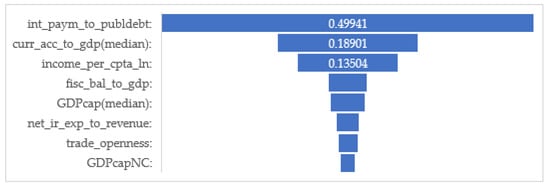 - Fiscal: In this group of factors, of primary importance is the fiscal balance-to-GDP ratio indicator, as the budget balance is the main driver of debt changes (Em et al. 2022). The importance in the burden of interest payments in relation to the size of the economy and the potential capacity of the country to service its obligations are tested using the interest payments on the public debt-to-GDP ratio indicator. On the other hand, we can measure the actual current debt burden for the budget using the Net interest-payments-to-government-revenue ratio.