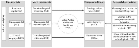 As previously discussed, there are many methodologies for assessing the total use of intellectual capital. At the same time, the individual components of intellectual capital can also characterize the degree of efficiency of an enterprise. In this paper, the methodology of intellectual capital assessment is based on the calculation of the value-added intellectual coefficient (VAIC). Taking into account all limitations and disadvantages of the model (a rather simplified structure of intellectual capital used by the method, inability to work correctly with non-standard values of equity capital, etc.) (), this model is suitable for working with a large number of observations and uses generally accepted indicators of company performance.