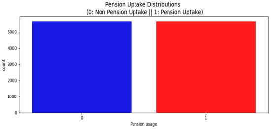 As shown in Figure 2, there was a significantly higher number in the non-pension uptake class compared to the pension uptake class. The pension uptake class had 1107 observations (representing 12.77% of the total) compared to the non-pension uptake class which had 7562 (representing 87.23% of the total). Therefore, the data used were imbalanced, and there was a need to handle the class imbalance problem. To handle this, resampling was used in this study. This was performed by either adding copies of instances from the under-represented class (i.e., up-sampling) or by deleting instances from the over-represented class (i.e., down-sampling). Both methods were performed simultaneously to enhance the robustness of the results. Figure 3 shows the class balance after the data were balanced through up-sampling. Similarly, the class balance after down-sampling is also shown but with fewer instances for the down-sampled data, as instances of the majority class were randomly deleted to balance with the minority class.