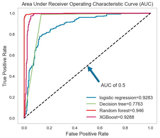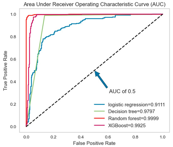 Table 2 further shows that random forest had the highest F1, recall, and precision scores (0.957443, 0.955881, and 0.961942 respectively), followed by XGBoost (0.955656, 0.954036, and 0.960484), decision tree classifier (0.941310, 0.939276, and 0.949136), and logistic regression (0.785855, 0.783468, and 0.784030). Based on the F1, recall, and precision scores, random forest was the most robust model when the data were up-sampled, and the tree-based ensemble models showed higher scores than the nonensemble algorithms.