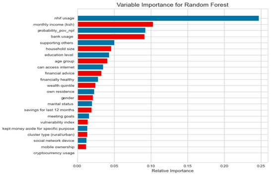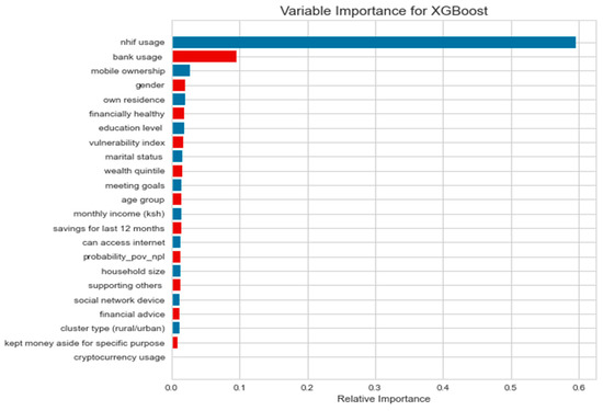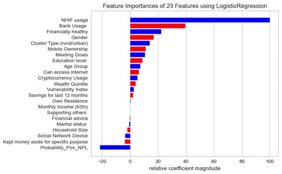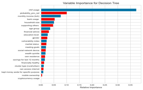 Figure 6, Figure 7, Figure 8 and Figure 9 show feature importance extracted from the random forest, XGBoost, decision tree, and logistic regression classifiers. The figures, with the exception of the variable importance extracted from the logistic regression classifier, seem to show little deviation in the importance they place on the features. For instance, all of the figures put NHIF usage as the most important feature. Therefore for the discussion, this paper adopted the order on the most robust model: random forest classifier. Table A1 and Figure 6 show the feature importance that was extracted from the random forest classifier. The features according to their importance were NHIF usage, monthly income, bank usage, poverty vulnerability, supporting others, education level, household size, age group, access to the Internet, source of financial advice, financial health, wealth quintile, ownership of the place of residence, marital status, savings in the previous 12 months, gender, whether one met one’s own goals, nature of residence—whether rural or urban, vulnerability index, keeping money aside for specific purpose, social network device used, mobile ownership, and cryptocurrency usage.