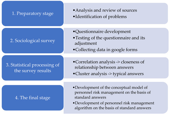 Correlation and cluster analyses were used in processing the answers of the respondents: correlation analysis was used to identify the closeness of the relationship between the answers and the correlation in the respondents’ choices, and cluster analysis was used to identify homogeneous groups of respondents and a detailed analysis of their answers. The Pearson coefficient was used in the correlation analysis, and the Gower distance, k-means method, and silhouette method were used in the cluster analysis. All these tools made it possible to identify lawful patterns in the respondents’ answers about personnel risks and requirements for the system of their management. Figure 1 shows the algorithm of this study.