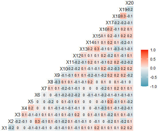 Correlogram of the respondents’ answers to the questionnaire. Note: Xi is the number of the question, the value in the Pearson correlation coefficient cell.