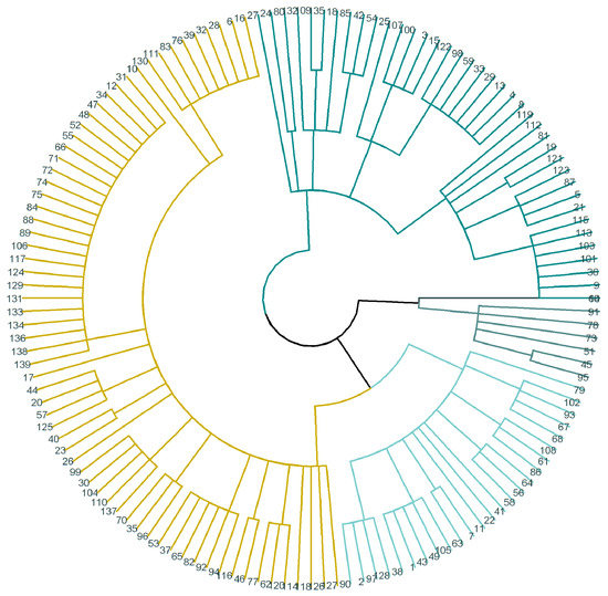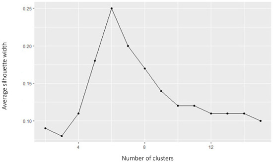 Among the parameters for assessing the quality of clustering, for example, one could refer to the parameter of the average silhouette width si. Its value can be described as a measure of the degree to which object i belongs. It can be calculated by Formula (2). The index ranged from −1 to 1. It was assumed that if \ si.\ < 0.25, objects were grouped “loosely”; in other words, clusters were heterogeneous, and clustering was performed poorly.