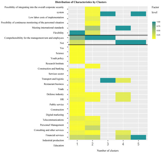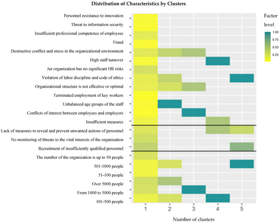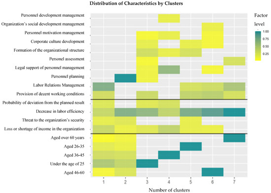 Figure 9 shows a heat map of the distribution of characteristics by the clusters of group III, which refer to the following problems of the study: industry of the organization (3), participant’s status (position) (6), and properties essential for the methodology for managing HR risks in the organization (19).