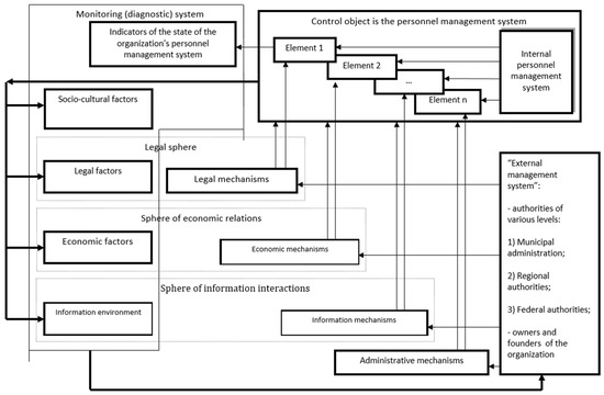 Figure 11 shows a conceptual model of an HR risk monitoring system. The existing personnel management system of an organization is chosen as the object of management. The content and processes in it act as an internal environment (of the system). The structure of the external system has constituent elements such as: authorities of various levels and the organization’s owners and founders. Their activities contribute to the formation of a legal, economic, informational, and administrative mechanism that determines the main regulation aspects of HR processes in the organization and establishes norms and standards they must comply with. The HR risk monitoring system includes some indicators of the state of the personnel management system and a number of factors that have to be considered in the assessment: socio-cultural, legal, and economic factors and the information environment of the organization. The HR risk monitoring system can be used to identify compliance with security standards and prevent security threats, which is accomplished through diagnosing the current state of the personnel management system.