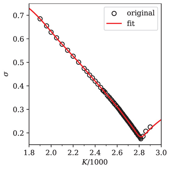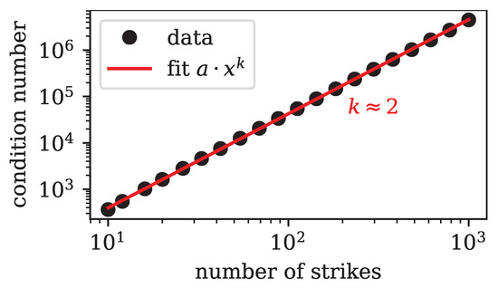 We fit the condition number of the matrix G with a power law of the form , where we take x to be the number of option strikes. The fit clearly reveals that , which means that the condition number increases quadratically with the number of options taken into account. Importantly, even if only as few as ten strikes are considered, we already have , i.e., the system is very ill-conditioned and any naive attempt at solving Equation (6) for will not succeed.