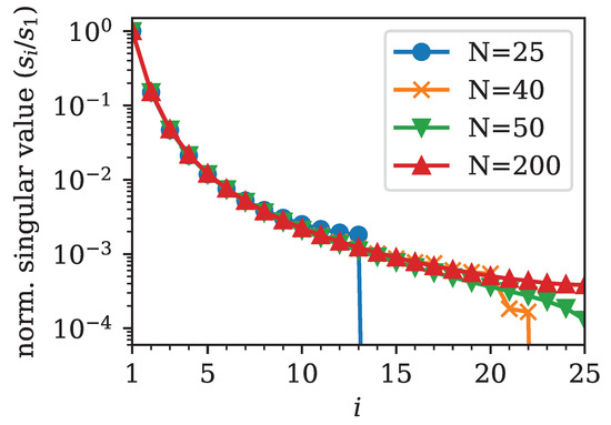 Here, we show that the singular values also decay rapidly for a fixed matrix G, i.e., for a fixed number of considered options M and for a fixed number of discretization points N within . We chose equidistant strikes in a fixed interval and varied the number of discretization points N. As before, we only took into account Call options. The normalized singular values are shown in Figure 2. We attempted to fit the decay of singular values with an inverse power law of the form . The initial decay seemed to follow such a law with roughly and slowed down a little for the tail of singular values.