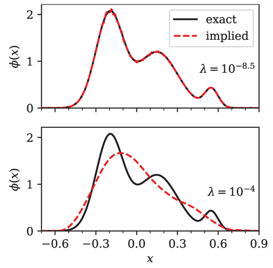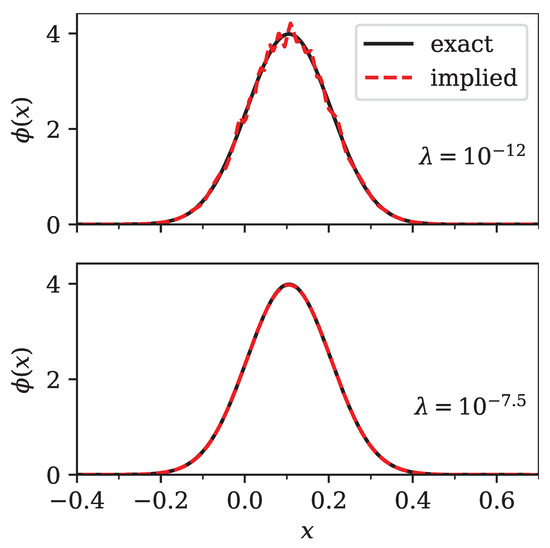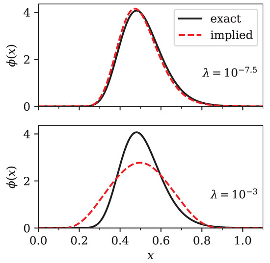 Comparison of the exact (bold line) and implied (dashed line) densities for two different values of the regularization parameter . The exact density was normal with and shifted to . The top panel shows an under-regularized implied density (), while the bottom panel shows a close to optimal implied density with .