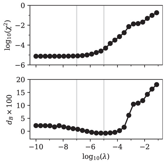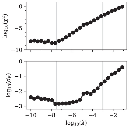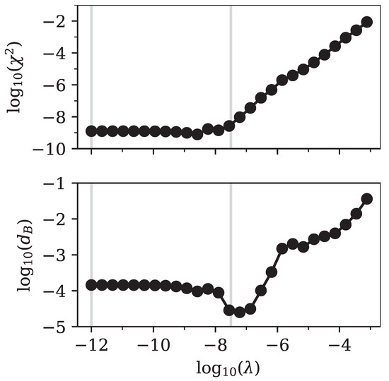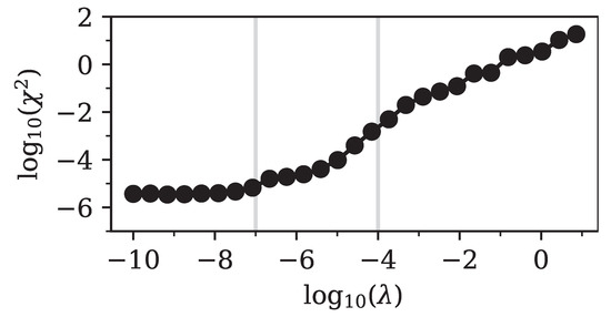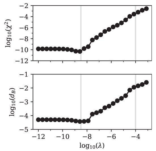 The point where the number of parameters sharply decreased was directly related to the minimum in the Bhattacharyya distance that we observed in Figure 4. For larger values of the regularization parameter, the fit simply became worse, since relevant components of were strongly suppressed. The fit tried to compensate for this by increasing the number of other non-zero components of , but failed to achieve good accuracy.