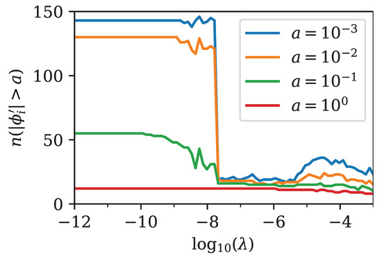 The effect of regularization on the optimized parameters could also be visualized by counting the number of entries in , for which the absolute value was above a threshold a. The visualization for a few different threshold values is shown in Figure 5. Recall that the number of entries in was . Figure 5 shows that for the problem was basically unregularized, and almost all parameters had a magnitude larger than . As soon as the regularization became effective, the number of parameters with significant magnitude drastically reduced, starting with those that had the least impact on the quality of the prices.