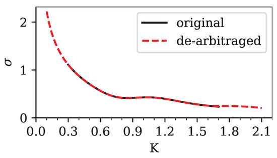 The comparison between input volatilities and the volatility smile extracted from our method is shown in Figure 15. The visible kink in the implied volatility around was well reproduced. Note again how our method enabled us to not only interpolate, but also extrapolate, implied volatilities even in challenging situations.