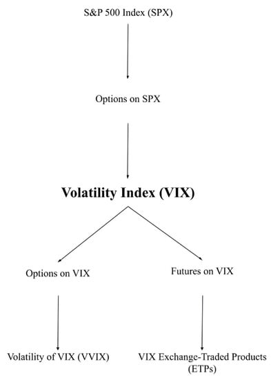 The Chicago Board Options Exchange’s (CBOE) Volatility Index (VIX) is a widely followed index that calculates the implied volatility of the U.S. stock market for the next 30 days. Colloquially referred to as the ‘Fear Gauge’, the VIX is updated every 15 s during a trading day. The VIX lies at the heart of the Volatility Complex, as illustrated in Figure 1, which influences how traders price the sprawl of volatility-linked assets.